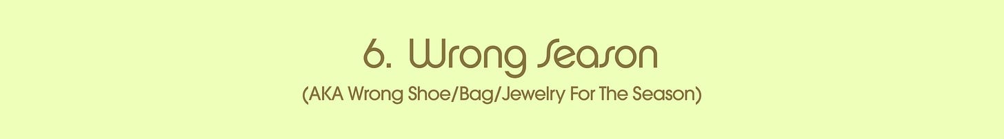 Throw on a wool trouser and a sweater, but add a flip-flop. Or throw on a chunky boot with your favorite spring dress. It is all about mixing it up here! And it doesn’t have to just be the shoe. Similar to the TEXTURE conversation, we can style a light woven bag with a chic wool wrap coat or a rich suede hobo bag to add some weight to a lighter trench coat. If the concept of “wrong shoe” feels hard for you to master or wrap your head around, this is a great time to play. The “wrong” element is just pulling something from the opposite season!!!