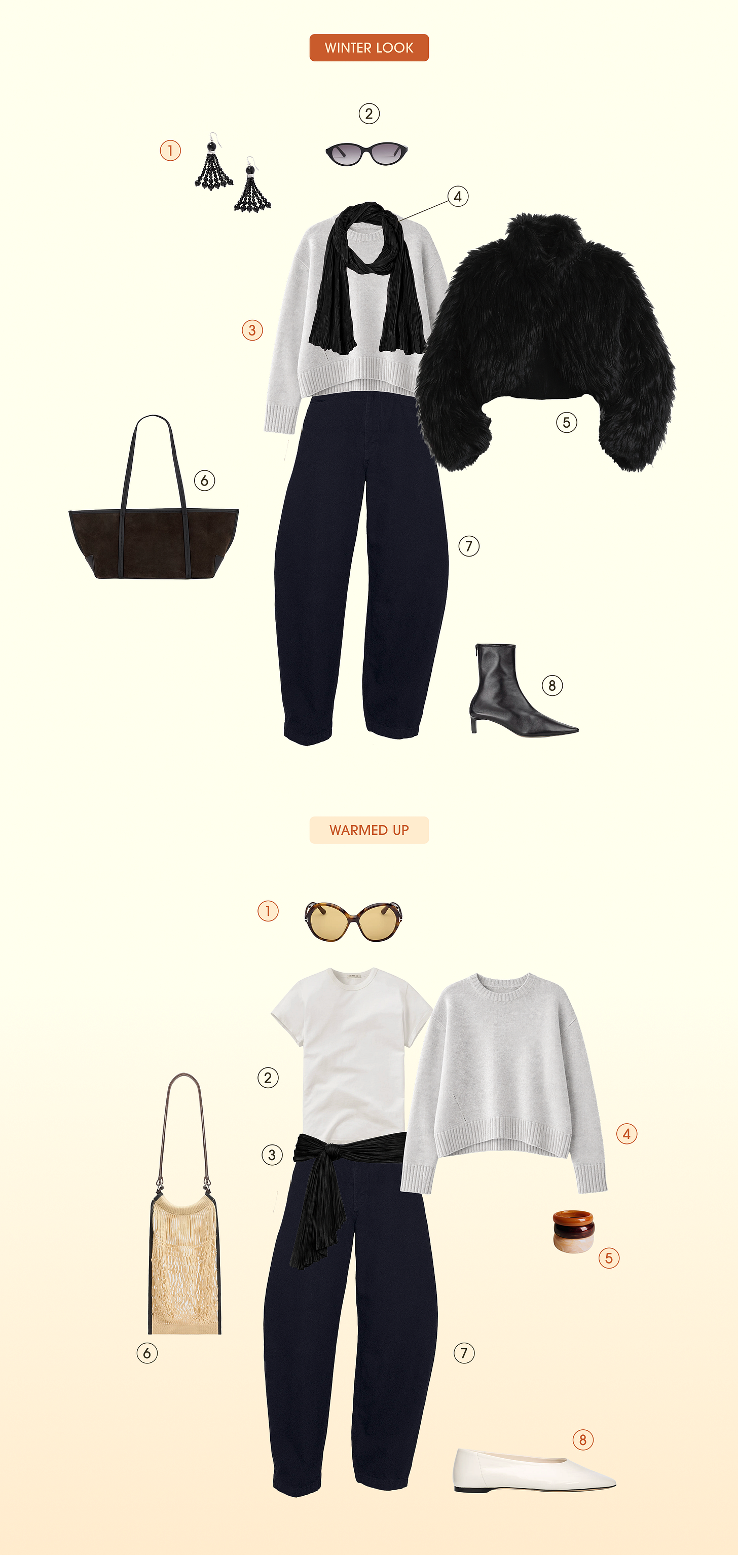And of course, the opposite is also true when it gets chilly again. Add knits and leather and suede to get the opposite effect!