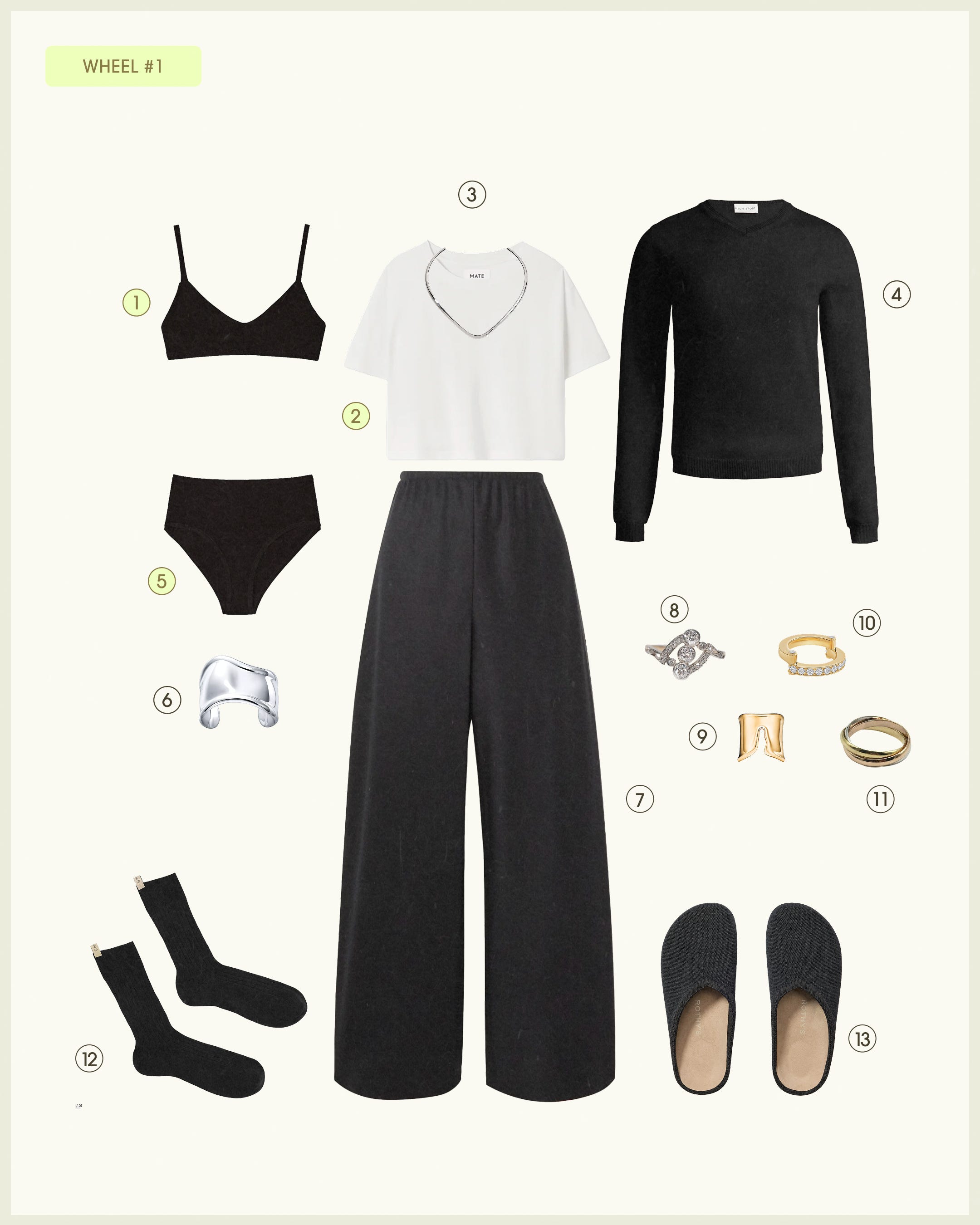 MATE tee, MATE triangle bra, MATE high waist brief, EREDE collar, HIGH SPORT sweater, TIFFANY & CO cuff, TIFFANY & CO ring, 1ST DIBS Vintage Cartier ring, 1ST DIBS antique ring, EREDE ring, THE ROW pant, COMME SI socks, ROTHY’S clog