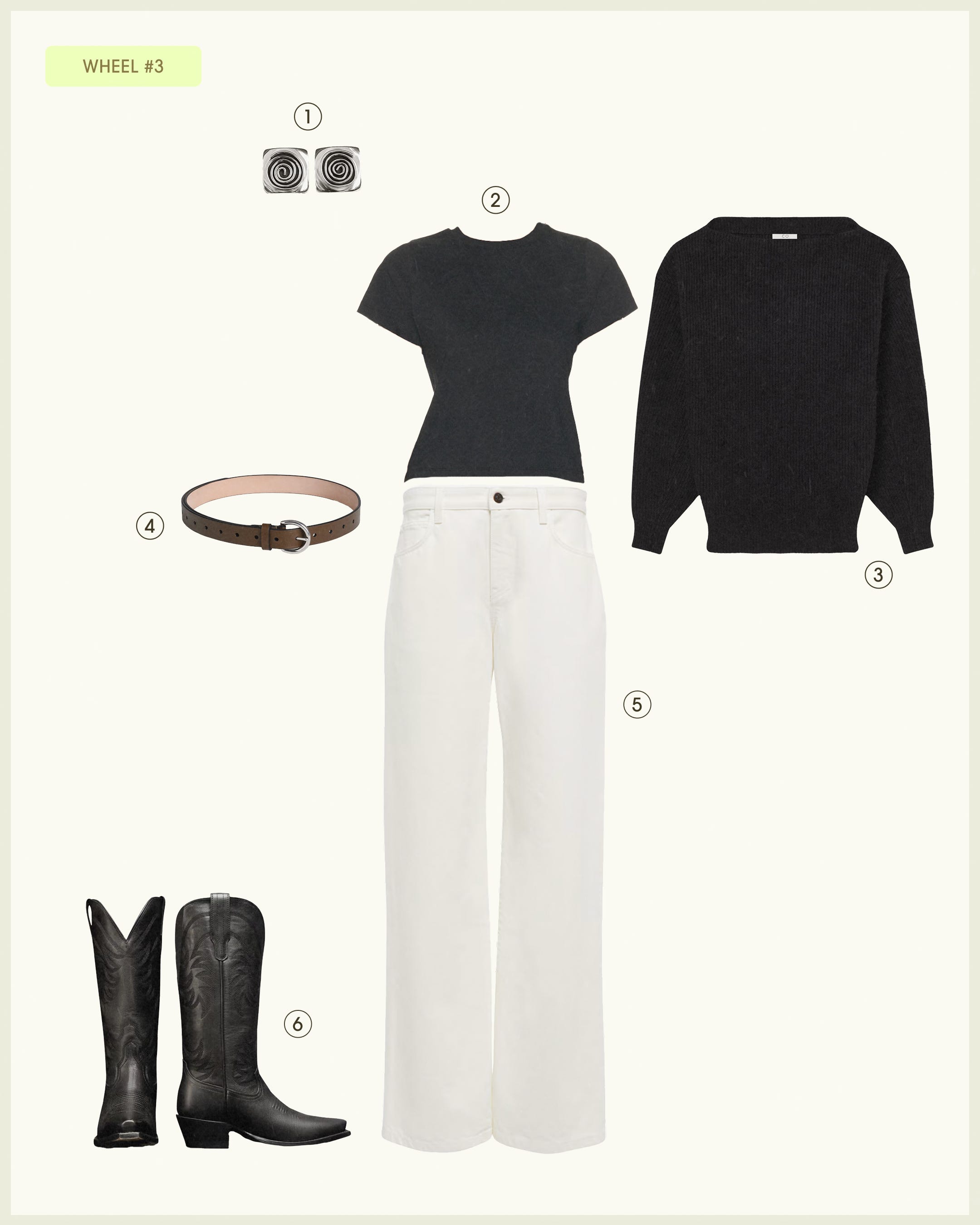 MAYA STEPPER earrings, RENGGLI tee, CO sweater, PHOEBE PHILO belt, THE ROW jeans, TECOVAS boots